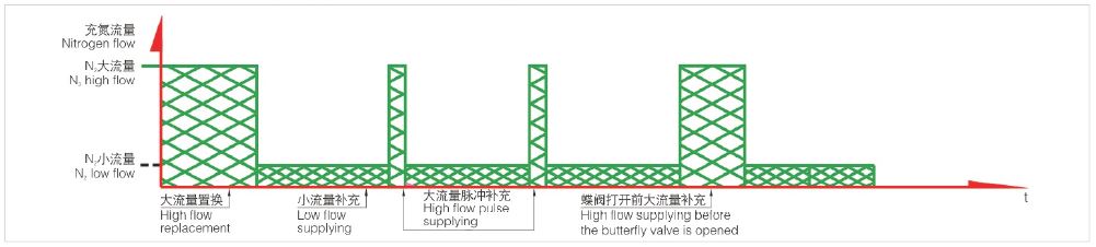 防爆型拉袋离心机采用防爆标准制作,在离心机主机开启前进行大流量氮气置换。通过氧气含量检测、压力检测等途径确保离心机机内气体惰性化,满足离心机运行要求。设备运行后,动态监测氧气含量,进行大流量氮气置换或小流量低压氮气补充,确保设备的隔爆运行要求。